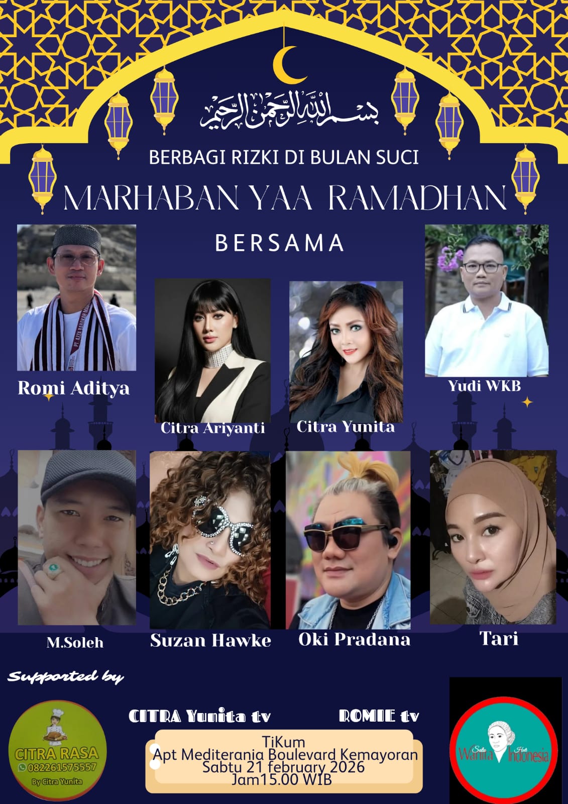 Menggelar berbagi berkah bulan Ramadhan tahun ini, Duo Citra (Citra Yunita dan Citra Ariyanti) bersama Romi Aditya kembali menggelar buka puasa bersama dan santunan anak yatim, pada 21 Februari 2026 di lokasi Kemayoran Jakarta Pusat. Sejumlah artis dan kolega turut mendukung aksi nyata tersebut.